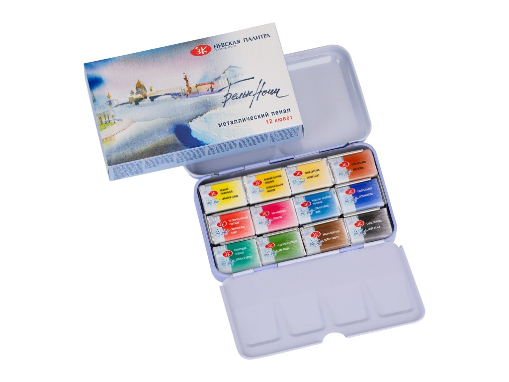 Набор художественных акварельных красок «Белые ночи» 12 цветов в кюветах в металлическом пенале и картонном футляре.