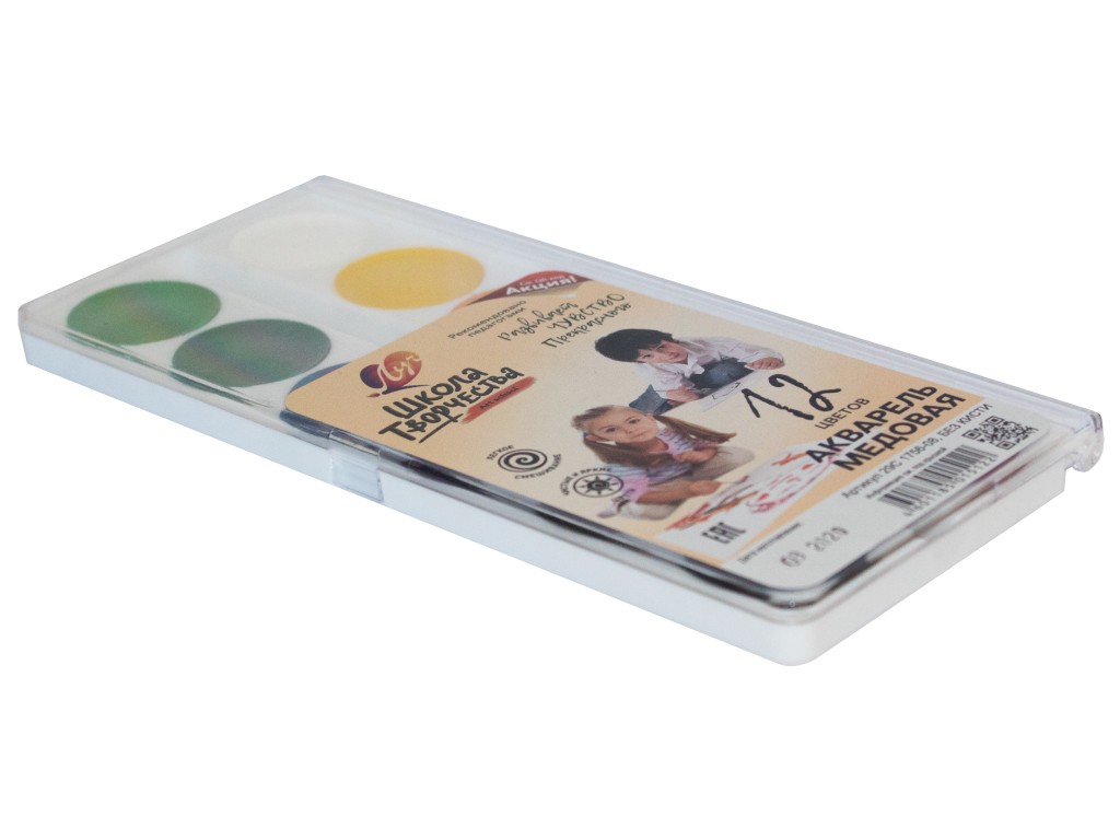 Медовая акварель изготовленная по классической рецептуре с яркими и чистыми цветами. Краска в подложке расположена группами: холодные-тёплые оттенки. Прекрасно размывается и разносится по поверхности бумаги, имея прозрачную основу без вкраплений. Краски смешиваются между собой, сохраняя насыщенность цвета.