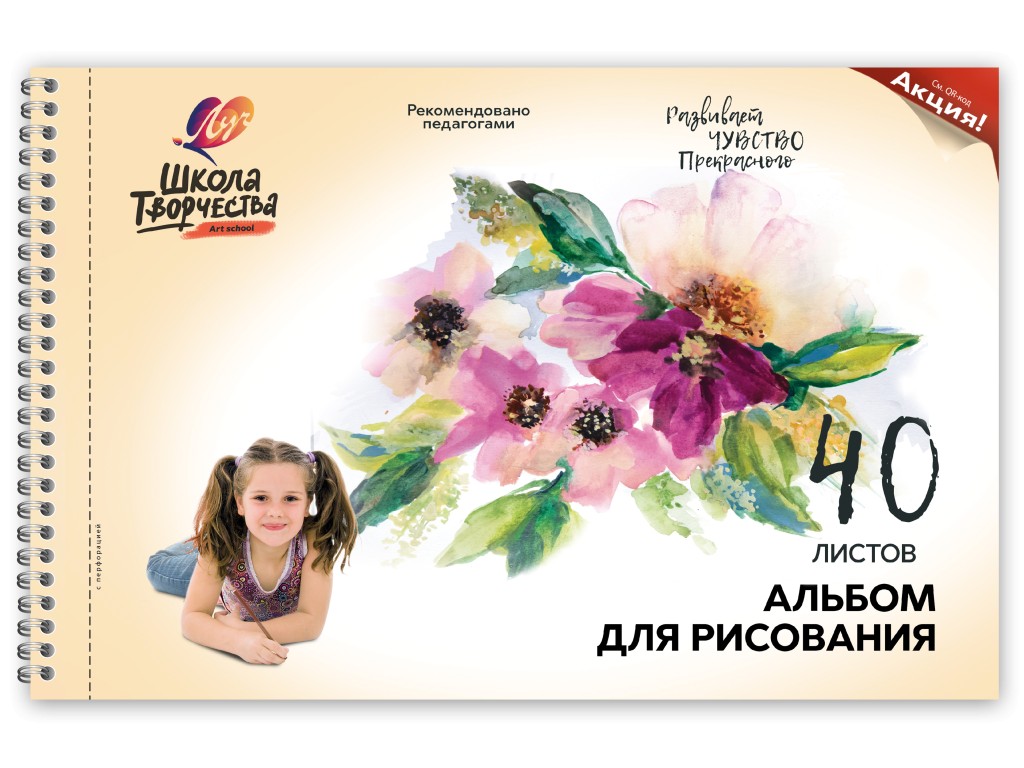 Честный размер альбома, формат А4 — 210*297мм. Обложка на пружине из высококачественного целюлозного картона плотностью 190г/м3. Внутренний блок из офсетной бумаги плотностью 100 г/м3 из 40 листов с перфорацией. На оборотной стороне каждого альбома мастер-класс по рисованию.