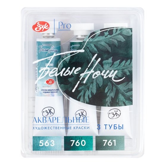 Профессиональные художественные акварельные краски «Белые ночи» представляют собой тонкодисперсные суспензии пигментов и наполнителей в связующем, в состав которого входит водный раствор растительного клея – гуммиарабика. Все акварельные краски в палитре «Белые ночи» безопасны, сертифицированы и соответствуют стандартам ASTM D-4236. Высокая концентрация пигмента обеспечивают максимальную интенсивность цветового тона акварели. Насыщенность сохраняется даже при разбавлении большим количеством воды. Отличаются прозрачностью, что дает возможность художнику работать тонкими лессировками. Чистые цвета позволяют писать в смесях и получать богатое многообразие оттенков. Основная часть красок обладает высочайшим показателем светостойкости, что способствует сохранности работ свыше 100 лет. Все это обеспечивает их высокое качество и возможность использования в ответственных работах. Набор гранулирующих акварельных художественных красок «Лес» «Белые Ночи» 3 тубы 10 мл в пластиковом коррексе. Палитра цветов набора: хром-кобальтовая дымка, зеленая мгла, таежная дымка