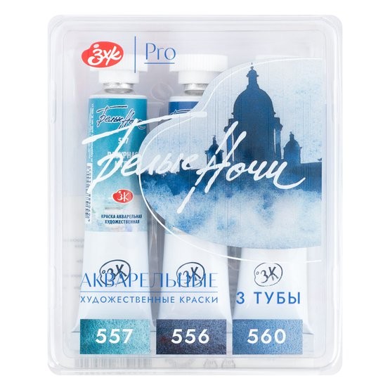 Профессиональные художественные акварельные краски «Белые ночи» представляют собой тонкодисперсные суспензии пигментов и наполнителей в связующем, в состав которого входит водный раствор растительного клея – гуммиарабика. Все акварельные краски в палитре «Белые ночи» безопасны, сертифицированы и соответствуют стандартам ASTM D-4236. Высокая концентрация пигмента обеспечивают максимальную интенсивность цветового тона акварели. Насыщенность сохраняется даже при разбавлении большим количеством воды. Отличаются прозрачностью, что дает возможность художнику работать тонкими лессировками. Чистые цвета позволяют писать в смесях и получать богатое многообразие оттенков. Основная часть красок обладает высочайшим показателем светостойкости, что способствует сохранности работ свыше 100 лет. Все это обеспечивает их высокое качество и возможность использования в ответственных работах. Набор гранулирующих акварельных художественных красок «Полночь» «Белые Ночи» 3 тубы 10 мл в пластиковом коррексе. Палитра цветов набора: лазурная мгла, голубая мгла, кобальтовая дымка.