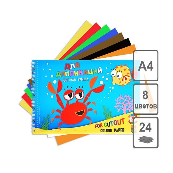 ПО-6833 Набор цветной бумаги «Крабик» Формат: 195х295 Кол-во цветов: 8 (зеленый, желтый, красный, оранжевый, коричневый, черный, синий, белый) Кол-во листов: 24 Набор на пружине для удобства использования, имеет перфорацию. Внутренний блок состоит из 3-х видов бумаги: цветной офсет, цветной двусторонний офсет, бумага газетная (зеленый, желтый, красный, оранжевый, коричневый, черный, синий, белый). Прекрасно подходит для аппликаций и поделок. Идеально для занятий в детском саду, школе и дома. Развивает моторику и объемно-пространственное мышление ребенка.
