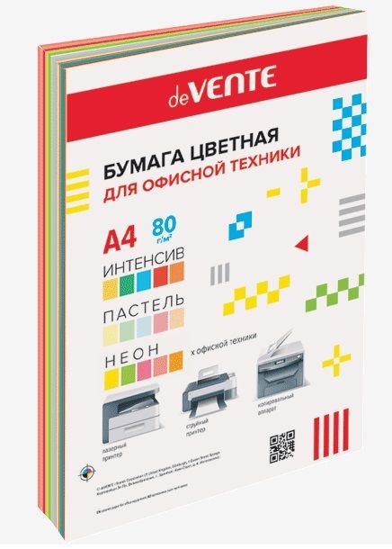 Бумага deVENTE 30 л, A4, 75-80 г/м, ассорти 15 цв (5 интенсивных, 5 пастельных и 5 неоновых цветов)