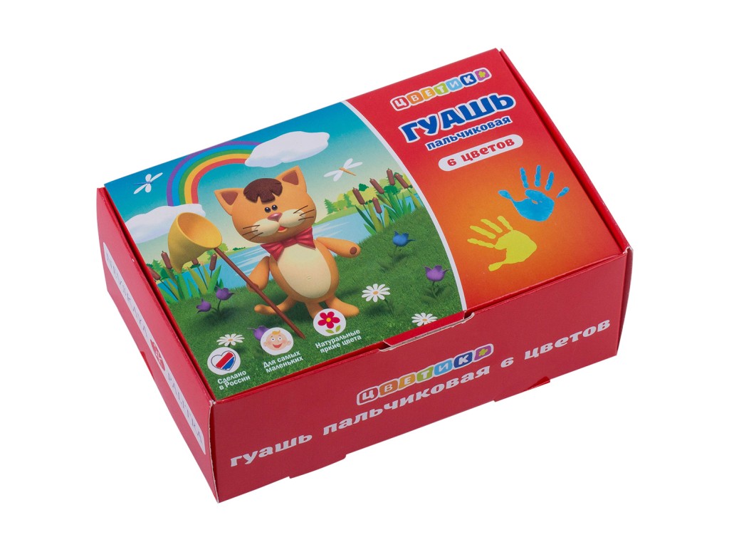 Пальчиковые гуашевые краски «Цветик» созданы специально для детского творчества и декоративно-оформительских работ. Рисование пальцами — веселый процесс, помогающий развивать тактильные ощущения у детей. Они также легко наносятся на бумагу и картон с помощью кисти. При высыхании приобретают матовую, бархатистую поверхность. Легко размываются водой. Краски отстирываются с боль- шинства типов тканей. После работы руки промойте теплой водой с мылом. Перед применением краску тщательно перемешать.