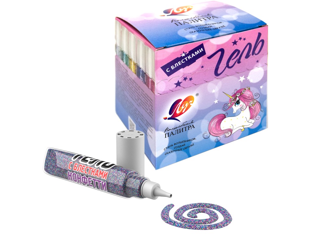 Гель «Конфетти» предназначен для придания необычных переливающихся эффектов, легко наносится на любую поверхность, при высыхании становится прозрачным, оставляя блестки. Используется для украшения рисунков, открыток, поделок из глины, гипса, воска, солёного теста, фольги, стекла и т.п. Время высыхания геля зависит от толщины слоя.Не имеет запаха. Безопасен для детей. В шоу-боксе 30 туб одинакового цвета.