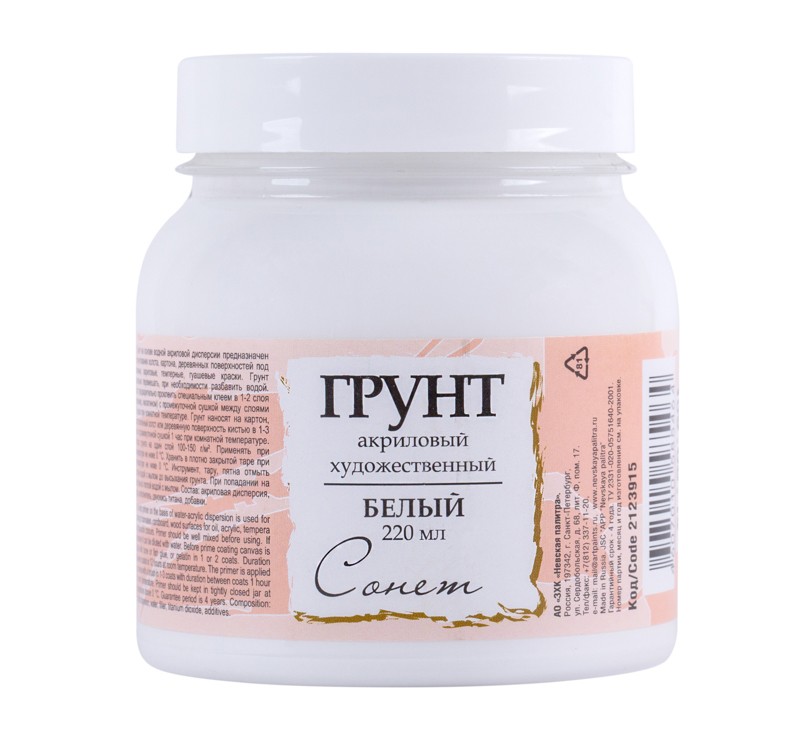 Грунт на основе водной акриловой дисперсии предназначен для грунтования холста, картона, деревянных поверхностей под масляные, акриловые, темперные, гуашевые краски. Перед использованием грунт необходимо тщательно перемешать, а при необходимости разбавить водой. Холст предварительно проклеить специальным клеем в 1-2 слоя с промежуточной сушкой между слоями 12 часов при комнатной температуре. Грунт наносят на картон, подготовленный холст или деревянную поверхность кистью в 1-3 слоя с промежуточной сушкой 1 час при комнатной температуре. Расход грунта на один слой 100-150 г/м2 . Применять при температуре не ниже 0 °С.
