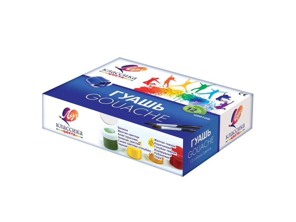 Гуашь для детского творчества, для выполнения художественно-декоративных и оформительских работ. Краски изготовлены на основе натуральных компонентов и высококачественных пигментов. На крышке имеется яркая этикетка с указанием цвета краски — удобство для покупателя, который сразу понимает, какой цвет ему нужен. Краске присущи яркие, красивые, чистые цвета, которые хорошо смешиваются, позволяя получать новые чистые цвета и оттенки. Гуашь имеет отличную укрывистость, при высыхании не выцветает, приобретает бархатистую поверхность. Гуашь легко смывается с рук и одежды и не имеет неприятного запаха. Безопасна для детского творчества, что подтверждено сертификатами (ЕАС).