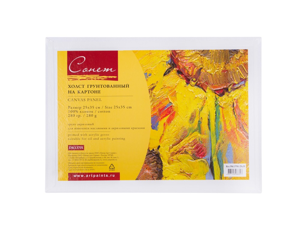 Холст на картоне «Сонет» изготовлен из 100 % хлопка, покрыт акриловым грунтом. Подходит для живописи масляными и акриловыми красками.