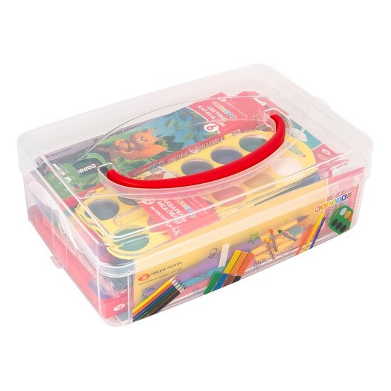 Набор «Цветик» 9 предметов содержит все самые необходимые материалы для детского творчества. Упакован набор в прозрачный пластиковый контейнер с ручкой, в котором удобно хранить материалы для занятий. Состав набора: 1. Набор акварели медовой «Цветик», 12 цветов 2. Набор гуаши «Цветик», 6 цветов в банках по 15 мл 3. Альбом для рисования «Цветик», 200х145 мм, 20 листов 4. Набор кистей «Цветик», синтетический ворс, 3 шт. 5. Набор цветных карандашей «Цветик», 6 цветов 6. Набор фломастеров «Цветик», 12 цветов 7. Набор трехгранных восковых мелков «Цветик», 12 цветов 8. Набор воскового пластилина, 8 цветов, 120 г 9. Точилка-бочонок «Цветик» с контейнером.
