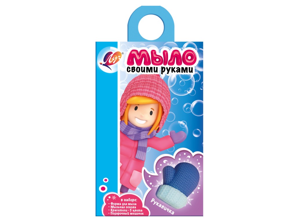 В состав набора входит: мыльная основа 100 гр., пищевые красители 3 цвета в тубах по 5мл., многоразовая форма для мыла, нарядный подарочный мешочек для упаковки готового мыла, пошаговая инструкция указана на упаковке. Упаковка — сумочка из картона.