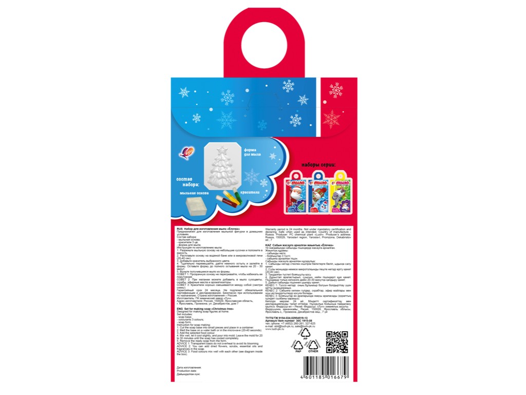 В состав набора входит: мыльная основа 100 гр., пищевые красители 3 цвета в тубах по 5мл., форма для мыла, пошаговая инструкция указана на упаковке. Упаковка — сумочка из картона.