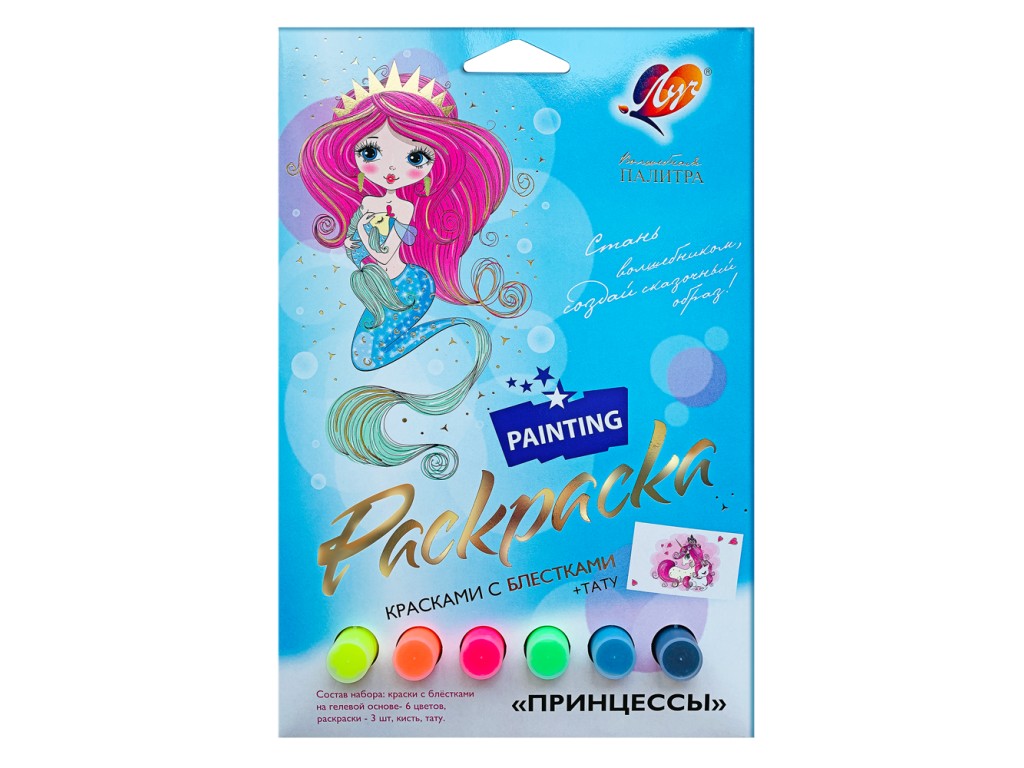 В набор для детского творчества входит 3 карточки с изображением стильных принцесс из плотного картона ( 1 карточка А4 формата, 2 карточки А5 формата), кисть «Пони» №3 для раскрашивания и яркие флуоресцентные краски на гелевой основе с миллиардами блёсток! Гелевые краски прекрасно смешиваются между собой и позволяют получить большую палитру дополнительных оттенков. Такой набор — отличный подарок каждой принцессе и моднице. Так же в каждый набор вложен подарок — яркая татуировка (смываемая и переводная картинка) с изображением милых мультяшных единорожек. На обороте есть инструкция по работе с набором и применением тату!