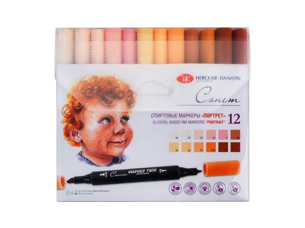 Общая палитра маркеров «Сонет» поштучно включает 110 цветов, в том числе блендер. Любой из цветов можно приобрести отдельно, расширив свою палитру. Для достижения наилучшего результата рекомендуем использовать альбом для маркеров «Сонет».