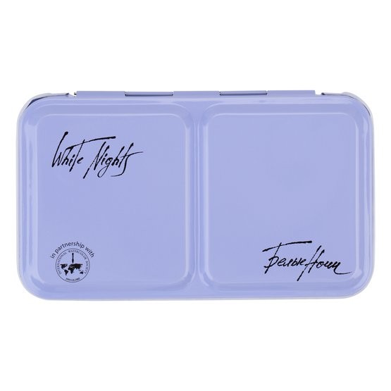 Пенал «Белые ночи» предназначен для размещения 12 акварельных кювет. Кюветы крепятся внутри пенала металлическими зажимами, зажимы поджимаются под нужный размер кюветы. Расстояние между кюветами внутри пенала можно использовать для размещения кистей или аксессуаров. С помощью пенала «Белые ночи» можно сделать индивидуальную подборку необходимых цветов, собрав свой идеальный набор красок. Конструкция пенала предусматривает палитру для смешивания красок, а так же кольцо для фиксации на пальце. Пенал изготовлен из металла, покрыт слоем краски, который надежно защищает сам пенал и палитру от коррозии. Размер 120х69х23 мм. Кюветы в комплект не входят.