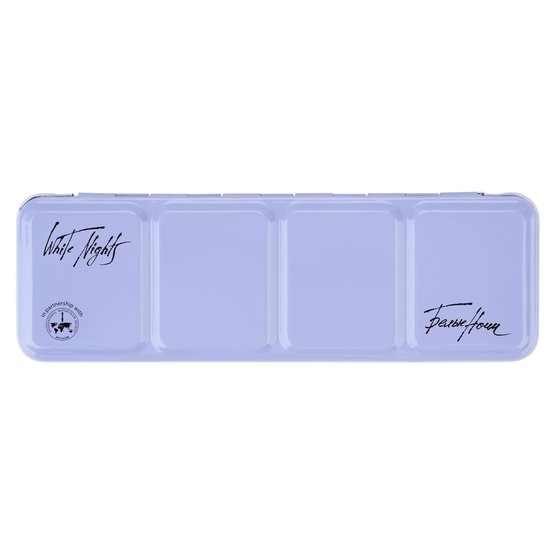 Пенал «Белые ночи» предназначен для размещения 21 акварельной кюветы. Кюветы крепятся внутри пенала металлическими зажимами, зажимы поджимаются под нужный размер кюветы. Расстояние между кюветами внутри пенала можно использовать для размещения кистей или аксессуаров. С помощью пенала «Белые ночи» можно сделать индивидуальную подборку необходимых цветов, собрав свой идеальный набор красок. Конструкция пенала предусматривает палитру для смешивания красок, а так же кольцо для фиксации на пальце. Пенал изготовлен из металла, покрыт слоем краски, который надежно защищает сам пенал и палитру от коррозии. Размер 221Х72,5Х20 мм. Кюветы в комплект не входят.