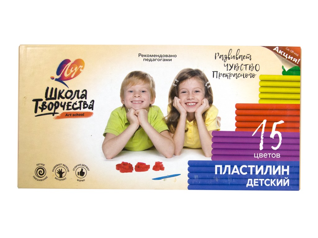 Пластилин детский «Школа творчества» изготовлен по новой рецептуре. Как и традиционный классический пластилин он обладает отличной пластичностью и органолептикой.Имеет красивые чистые цвета с матовым эффектом. Держит форму, не плавится, не растекается при высоких температурах (до +40 градусов С). Можно использовать в технике рисования, так как в отличие от классического пластилина при размазывании по бумаге даёт дорожку длиннее на 30%. Легко смывается водой или влажной салфеткой с любой поверхности.