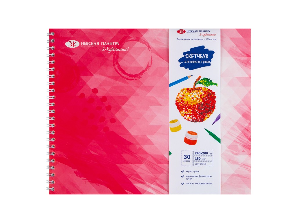Скетчбук «Я-Художник!» содержит 30 листов, плотностью 180 г, 250х200 мм. Бумага скетчбука высокой плотности подойдет для работ гуашью, акриловыми красками, а также скетч-зарисовок в смешанных техниках.