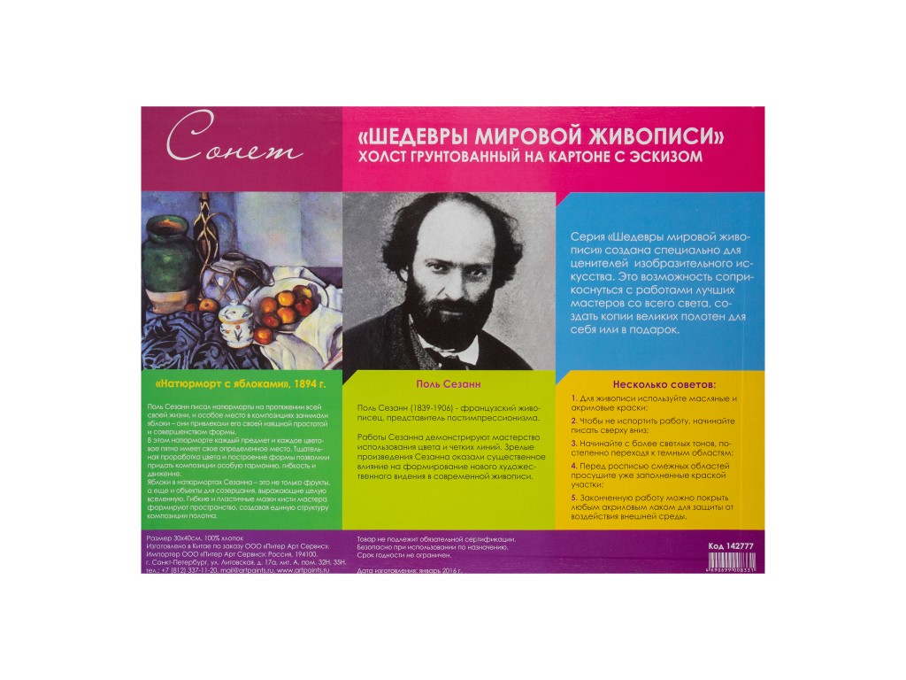 Холст на картоне «Сонет» с эскизом изготовен из 100 % хлопка. Серия «Шедевры живописи» создана специально для ценителей изобразительного искусства. Это возможность соприкоснуться с работами лучших мастеров со всего света, создать копии великих полотен для себя или в подарок.
