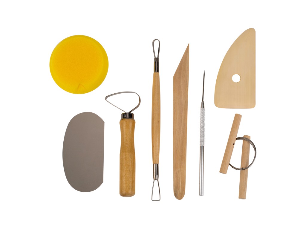 1- деревянный резец, 1-деревянный стек, 2-стека с петлёй, 1-шило из нержавеющей стали, 1-стальная проволока, 1-скребок алюминиевый, 1-губка из поролона.