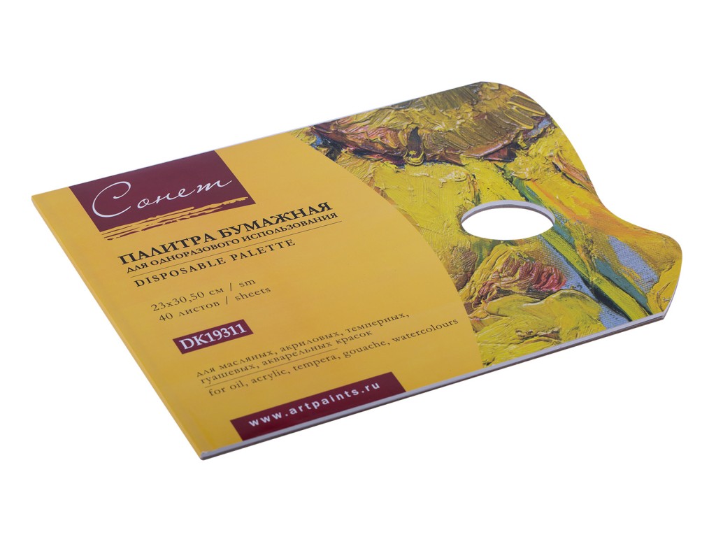 Палитра «Сонет» бумажная, прямоугольная, для одноразового использования, 40 листов размером 23х30,5 см. Подходит для применения с масляными, акриловыми, темперными, гуашевыми и акварельными красками.