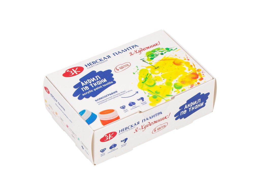 Акриловые краски по ткани для детского творчества на основе водной акриловой дисперсии. Краски предназначены для росписи хлопчатобумажных тканей. Ткань предварительно выстирайте, выгладите и расположите на рабочем столе. Перед применением краску тщательно перемешайте. Нанесите краску кисть тонким, ровным слоем. Просушите роспись в течение 24 часов. Прогладьте утюгом без пара 5 минут через х/б ткань, при температуре, соответствующей х/б ткани. Спустя 48 часов после проглаживания допускается стирка изделия мягкими моющими средствами при температуре от 30 °С до 40 °С без сильного механического воздействия. Храните краски в плотно закрытой таре. После работы руки вымыть с мылом, кисти и инструменты промыть водой. Для детей старше 3 лет. Внимание! Использовать только под непосредственным наблюдением взрослых.